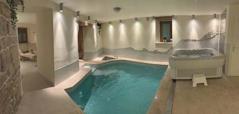 Indoor zwembad met tegenstroom, Jacuzzi, voetenbad, douches, sauna en massagematras.